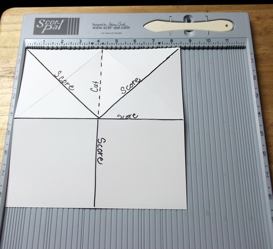 square sheet of paper. I’m using 8 ½" x 8 ½". Score at the half way
